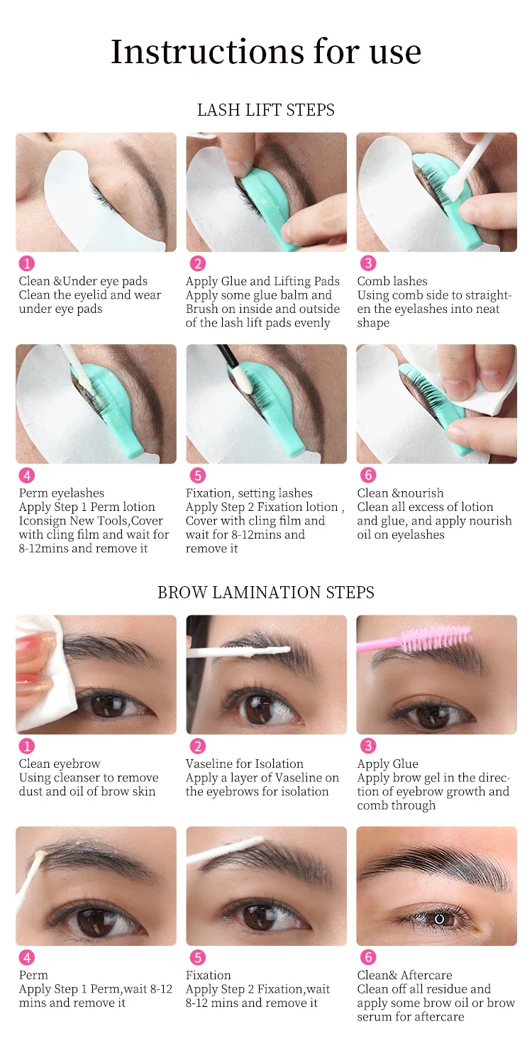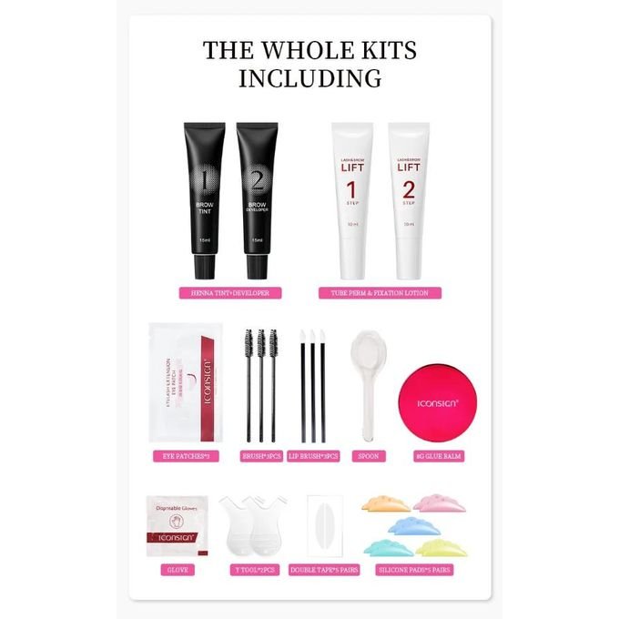 - Kit de rehaussement de cils et de teinture des sourcils ICONSIGN. Maintient le rehaussement des cils pendant 25 à 35 jours. Teinture des sourcils pendant 50 à 70 jours.